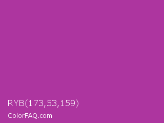 RYB 173,53,159 Color is a normal magenta color and the nearest color is Byzantine #bd33a4. Hex code #ad359f and RGB value is rgb(173,53,159). In RGB color space, this color is composed of 68% red, 21% green, 62% blue, In CMYK color space, this color is composed of 0% cyan, 69% magenta, 8% yellow , 32% black , In HSL color space, this color has a hue angle of 307° , 53% saturation and 44% lightness.