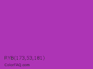 RYB 173,53,181 Color is a normal magenta color and the nearest color is Byzantine #bd33a4. Hex code #ad35b5 and RGB value is rgb(173,53,181). In RGB color space, this color is composed of 68% red, 21% green, 71% blue, In CMYK color space, this color is composed of 4% cyan, 71% magenta, 0% yellow , 29% black , In HSL color space, this color has a hue angle of 296° , 55% saturation and 46% lightness.