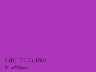 RYB 173,53,186 Color is a normal magenta color and the nearest color is Dark Orchid #9932cc. Hex code #ad35ba and RGB value is rgb(173,53,186). In RGB color space, this color is composed of 68% red, 21% green, 73% blue, In CMYK color space, this color is composed of 7% cyan, 72% magenta, 0% yellow , 27% black , In HSL color space, this color has a hue angle of 294° , 56% saturation and 47% lightness.