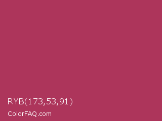RYB 173,53,91 Color is a normal rose color and the nearest color is Night Shadz #aa375a. Hex code #ad355b and RGB value is rgb(173,53,91). In RGB color space, this color is composed of 68% red, 21% green, 36% blue, In CMYK color space, this color is composed of 0% cyan, 69% magenta, 47% yellow , 32% black , In HSL color space, this color has a hue angle of 341° , 53% saturation and 44% lightness.