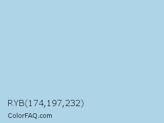 RYB 174,197,232 Color is a light blue color and the nearest color is Light Blue #add8e6. Hex code #aed4e8 and RGB value is rgb(174,212,232). In RGB color space, this color is composed of 68% red, 83% green, 91% blue, In CMYK color space, this color is composed of 25% cyan, 9% magenta, 0% yellow , 9% black , In HSL color space, this color has a hue angle of 201° , 56% saturation and 80% lightness.