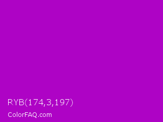 RYB 174,3,197 Color is a normal magenta color and the nearest color is Heliotrope Magenta #aa00bb. Hex code #ae03c5 and RGB value is rgb(174,3,197). In RGB color space, this color is composed of 68% red, 1% green, 77% blue, In CMYK color space, this color is composed of 12% cyan, 98% magenta, 0% yellow , 23% black , In HSL color space, this color has a hue angle of 293° , 97% saturation and 39% lightness.