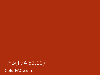 RYB 174,53,13 Color is a normal red color and the nearest color is Tabasco #a02712. Hex code #ae2d0d and RGB value is rgb(174,45,13). In RGB color space, this color is composed of 68% red, 18% green, 5% blue, In CMYK color space, this color is composed of 0% cyan, 74% magenta, 93% yellow , 32% black , In HSL color space, this color has a hue angle of 12° , 86% saturation and 37% lightness.