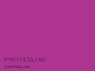 RYB 174,53,146 Color is a normal magenta color and the nearest color is Fandango #b53389. Hex code #ae3592 and RGB value is rgb(174,53,146). In RGB color space, this color is composed of 68% red, 21% green, 57% blue, In CMYK color space, this color is composed of 0% cyan, 70% magenta, 16% yellow , 32% black , In HSL color space, this color has a hue angle of 314° , 53% saturation and 45% lightness.