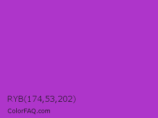 RYB 174,53,202 Color is a normal purple color and the nearest color is Dark Orchid #9932cc. Hex code #ae35ca and RGB value is rgb(174,53,202). In RGB color space, this color is composed of 68% red, 21% green, 79% blue, In CMYK color space, this color is composed of 14% cyan, 74% magenta, 0% yellow , 21% black , In HSL color space, this color has a hue angle of 289° , 58% saturation and 50% lightness.