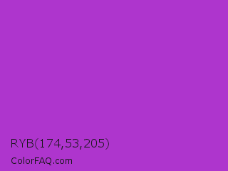 RYB 174,53,205 Color is a normal purple color and the nearest color is Dark Orchid #9932cc. Hex code #ae35cd and RGB value is rgb(174,53,205). In RGB color space, this color is composed of 68% red, 21% green, 80% blue, In CMYK color space, this color is composed of 15% cyan, 74% magenta, 0% yellow , 20% black , In HSL color space, this color has a hue angle of 288° , 60% saturation and 51% lightness.