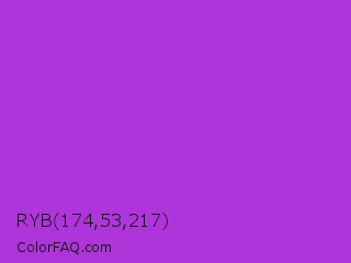 RYB 174,53,217 Color is a normal purple color and the nearest color is Dark Orchid #9932cc. Hex code #ae35d9 and RGB value is rgb(174,53,217). In RGB color space, this color is composed of 68% red, 21% green, 85% blue, In CMYK color space, this color is composed of 20% cyan, 76% magenta, 0% yellow , 15% black , In HSL color space, this color has a hue angle of 284° , 68% saturation and 53% lightness.