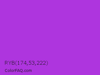 RYB 174,53,222 Color is a normal purple color and the nearest color is Dark Orchid #9932cc. Hex code #ae35de and RGB value is rgb(174,53,222). In RGB color space, this color is composed of 68% red, 21% green, 87% blue, In CMYK color space, this color is composed of 22% cyan, 76% magenta, 0% yellow , 13% black , In HSL color space, this color has a hue angle of 283° , 72% saturation and 54% lightness.