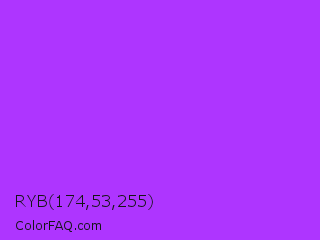 RYB 174,53,255 Color is a normal purple color and the nearest color is Veronica #a020f0. Hex code #ae35ff and RGB value is rgb(174,53,255). In RGB color space, this color is composed of 68% red, 21% green, 100% blue, In CMYK color space, this color is composed of 32% cyan, 79% magenta, 0% yellow , 0% black , In HSL color space, this color has a hue angle of 276° , 100% saturation and 60% lightness.