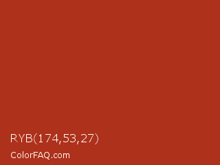 RYB 174,53,27 Color is a normal red color and the nearest color is Chinese Red #aa381e. Hex code #ae311b and RGB value is rgb(174,49,27). In RGB color space, this color is composed of 68% red, 19% green, 11% blue, In CMYK color space, this color is composed of 0% cyan, 72% magenta, 84% yellow , 32% black , In HSL color space, this color has a hue angle of 9° , 73% saturation and 39% lightness.