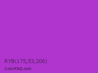 RYB 175,53,206 Color is a normal purple color and the nearest color is Dark Orchid #9932cc. Hex code #af35ce and RGB value is rgb(175,53,206). In RGB color space, this color is composed of 69% red, 21% green, 81% blue, In CMYK color space, this color is composed of 15% cyan, 74% magenta, 0% yellow , 19% black , In HSL color space, this color has a hue angle of 288° , 61% saturation and 51% lightness.