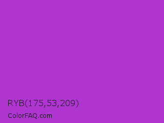 RYB 175,53,209 Color is a normal purple color and the nearest color is Dark Orchid #9932cc. Hex code #af35d1 and RGB value is rgb(175,53,209). In RGB color space, this color is composed of 69% red, 21% green, 82% blue, In CMYK color space, this color is composed of 16% cyan, 75% magenta, 0% yellow , 18% black , In HSL color space, this color has a hue angle of 287° , 63% saturation and 51% lightness.