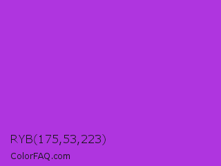 RYB 175,53,223 Color is a normal purple color and the nearest color is Dark Orchid #9932cc. Hex code #af35df and RGB value is rgb(175,53,223). In RGB color space, this color is composed of 69% red, 21% green, 87% blue, In CMYK color space, this color is composed of 22% cyan, 76% magenta, 0% yellow , 13% black , In HSL color space, this color has a hue angle of 283° , 73% saturation and 54% lightness.