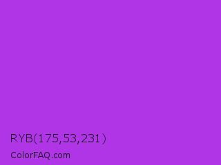 RYB 175,53,231 Color is a normal purple color and the nearest color is Veronica #a020f0. Hex code #af35e7 and RGB value is rgb(175,53,231). In RGB color space, this color is composed of 69% red, 21% green, 91% blue, In CMYK color space, this color is composed of 24% cyan, 77% magenta, 0% yellow , 9% black , In HSL color space, this color has a hue angle of 281° , 79% saturation and 56% lightness.