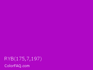 RYB 175,7,197 Color is a normal magenta color and the nearest color is Heliotrope Magenta #aa00bb. Hex code #af07c5 and RGB value is rgb(175,7,197). In RGB color space, this color is composed of 69% red, 3% green, 77% blue, In CMYK color space, this color is composed of 11% cyan, 96% magenta, 0% yellow , 23% black , In HSL color space, this color has a hue angle of 293° , 93% saturation and 40% lightness.