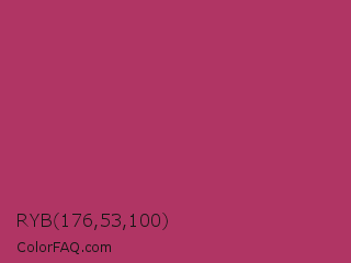 RYB 176,53,100 Color is a normal rose color and the nearest color is Rich Maroon #b03060. Hex code #b03564 and RGB value is rgb(176,53,100). In RGB color space, this color is composed of 69% red, 21% green, 39% blue, In CMYK color space, this color is composed of 0% cyan, 70% magenta, 43% yellow , 31% black , In HSL color space, this color has a hue angle of 337° , 54% saturation and 45% lightness.