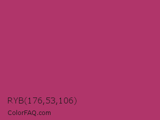 RYB 176,53,106 Color is a normal rose color and the nearest color is Hibiscus #b6316c. Hex code #b0356a and RGB value is rgb(176,53,106). In RGB color space, this color is composed of 69% red, 21% green, 42% blue, In CMYK color space, this color is composed of 0% cyan, 70% magenta, 40% yellow , 31% black , In HSL color space, this color has a hue angle of 334° , 54% saturation and 45% lightness.