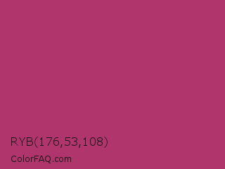 RYB 176,53,108 Color is a normal rose color and the nearest color is Hibiscus #b6316c. Hex code #b0356c and RGB value is rgb(176,53,108). In RGB color space, this color is composed of 69% red, 21% green, 42% blue, In CMYK color space, this color is composed of 0% cyan, 70% magenta, 39% yellow , 31% black , In HSL color space, this color has a hue angle of 333° , 54% saturation and 45% lightness.