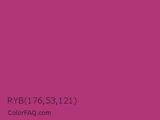 RYB 176,53,121 Color is a normal magenta color and the nearest color is Royal Heath #ab3472. Hex code #b03579 and RGB value is rgb(176,53,121). In RGB color space, this color is composed of 69% red, 21% green, 47% blue, In CMYK color space, this color is composed of 0% cyan, 70% magenta, 31% yellow , 31% black , In HSL color space, this color has a hue angle of 327° , 54% saturation and 45% lightness.