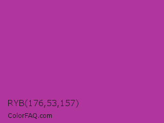RYB 176,53,157 Color is a normal magenta color and the nearest color is Byzantine #bd33a4. Hex code #b0359d and RGB value is rgb(176,53,157). In RGB color space, this color is composed of 69% red, 21% green, 62% blue, In CMYK color space, this color is composed of 0% cyan, 70% magenta, 11% yellow , 31% black , In HSL color space, this color has a hue angle of 309° , 54% saturation and 45% lightness.