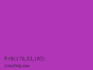 RYB 176,53,183 Color is a normal magenta color and the nearest color is Byzantine #bd33a4. Hex code #b035b7 and RGB value is rgb(176,53,183). In RGB color space, this color is composed of 69% red, 21% green, 72% blue, In CMYK color space, this color is composed of 4% cyan, 71% magenta, 0% yellow , 28% black , In HSL color space, this color has a hue angle of 297° , 55% saturation and 46% lightness.