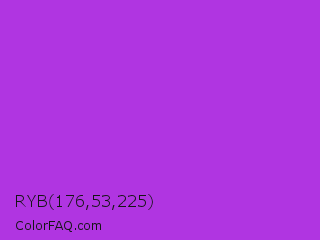 RYB 176,53,225 Color is a normal purple color and the nearest color is Veronica #a020f0. Hex code #b035e1 and RGB value is rgb(176,53,225). In RGB color space, this color is composed of 69% red, 21% green, 88% blue, In CMYK color space, this color is composed of 22% cyan, 76% magenta, 0% yellow , 12% black , In HSL color space, this color has a hue angle of 283° , 74% saturation and 55% lightness.