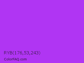 RYB 176,53,243 Color is a normal purple color and the nearest color is Veronica #a020f0. Hex code #b035f3 and RGB value is rgb(176,53,243). In RGB color space, this color is composed of 69% red, 21% green, 95% blue, In CMYK color space, this color is composed of 28% cyan, 78% magenta, 0% yellow , 5% black , In HSL color space, this color has a hue angle of 279° , 89% saturation and 58% lightness.