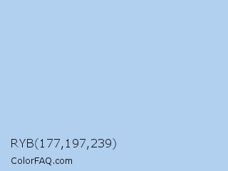 RYB 177,197,239 Color is a very light blue color and the nearest color is Pale Cornflower Blue #abcdef. Hex code #b1cfef and RGB value is rgb(177,207,239). In RGB color space, this color is composed of 69% red, 81% green, 94% blue, In CMYK color space, this color is composed of 26% cyan, 13% magenta, 0% yellow , 6% black , In HSL color space, this color has a hue angle of 211° , 66% saturation and 82% lightness.