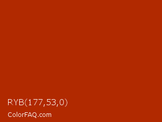 RYB 177,53,0 Color is a normal red color and the nearest color is Rufous #a81c07. Hex code #b12900 and RGB value is rgb(177,41,0). In RGB color space, this color is composed of 69% red, 16% green, 0% blue, In CMYK color space, this color is composed of 0% cyan, 77% magenta, 100% yellow , 31% black , In HSL color space, this color has a hue angle of 14° , 100% saturation and 35% lightness.