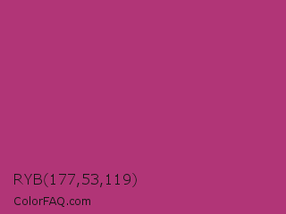 RYB 177,53,119 Color is a normal rose color and the nearest color is Royal Heath #ab3472. Hex code #b13577 and RGB value is rgb(177,53,119). In RGB color space, this color is composed of 69% red, 21% green, 47% blue, In CMYK color space, this color is composed of 0% cyan, 70% magenta, 33% yellow , 31% black , In HSL color space, this color has a hue angle of 328° , 54% saturation and 45% lightness.