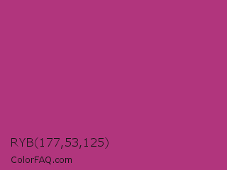 RYB 177,53,125 Color is a normal magenta color and the nearest color is Royal Heath #ab3472. Hex code #b1357d and RGB value is rgb(177,53,125). In RGB color space, this color is composed of 69% red, 21% green, 49% blue, In CMYK color space, this color is composed of 0% cyan, 70% magenta, 29% yellow , 31% black , In HSL color space, this color has a hue angle of 325° , 54% saturation and 45% lightness.