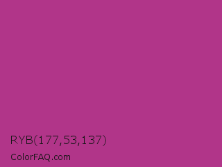 RYB 177,53,137 Color is a normal magenta color and the nearest color is Fandango #b53389. Hex code #b13589 and RGB value is rgb(177,53,137). In RGB color space, this color is composed of 69% red, 21% green, 54% blue, In CMYK color space, this color is composed of 0% cyan, 70% magenta, 23% yellow , 31% black , In HSL color space, this color has a hue angle of 319° , 54% saturation and 45% lightness.