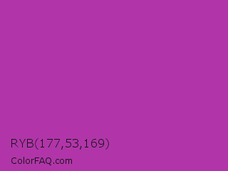 RYB 177,53,169 Color is a normal magenta color and the nearest color is Byzantine #bd33a4. Hex code #b135a9 and RGB value is rgb(177,53,169). In RGB color space, this color is composed of 69% red, 21% green, 66% blue, In CMYK color space, this color is composed of 0% cyan, 70% magenta, 5% yellow , 31% black , In HSL color space, this color has a hue angle of 304° , 54% saturation and 45% lightness.