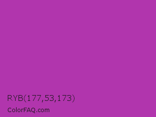 RYB 177,53,173 Color is a normal magenta color and the nearest color is Byzantine #bd33a4. Hex code #b135ad and RGB value is rgb(177,53,173). In RGB color space, this color is composed of 69% red, 21% green, 68% blue, In CMYK color space, this color is composed of 0% cyan, 70% magenta, 2% yellow , 31% black , In HSL color space, this color has a hue angle of 302° , 54% saturation and 45% lightness.