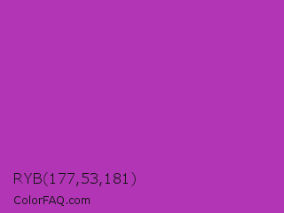 RYB 177,53,181 Color is a normal magenta color and the nearest color is Byzantine #bd33a4. Hex code #b135b5 and RGB value is rgb(177,53,181). In RGB color space, this color is composed of 69% red, 21% green, 71% blue, In CMYK color space, this color is composed of 2% cyan, 71% magenta, 0% yellow , 29% black , In HSL color space, this color has a hue angle of 298° , 55% saturation and 46% lightness.