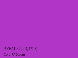 RYB 177,53,199 Color is a normal purple color and the nearest color is Dark Orchid #9932cc. Hex code #b135c7 and RGB value is rgb(177,53,199). In RGB color space, this color is composed of 69% red, 21% green, 78% blue, In CMYK color space, this color is composed of 11% cyan, 73% magenta, 0% yellow , 22% black , In HSL color space, this color has a hue angle of 291° , 58% saturation and 49% lightness.