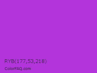 RYB 177,53,218 Color is a normal purple color and the nearest color is Dark Orchid #9932cc. Hex code #b135da and RGB value is rgb(177,53,218). In RGB color space, this color is composed of 69% red, 21% green, 85% blue, In CMYK color space, this color is composed of 19% cyan, 76% magenta, 0% yellow , 15% black , In HSL color space, this color has a hue angle of 285° , 69% saturation and 53% lightness.