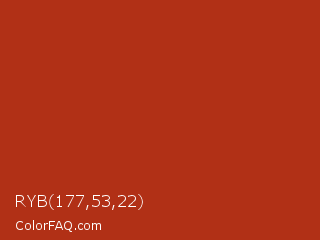 RYB 177,53,22 Color is a normal red color and the nearest color is Chinese Red #aa381e. Hex code #b13016 and RGB value is rgb(177,48,22). In RGB color space, this color is composed of 69% red, 19% green, 9% blue, In CMYK color space, this color is composed of 0% cyan, 73% magenta, 88% yellow , 31% black , In HSL color space, this color has a hue angle of 10° , 78% saturation and 39% lightness.