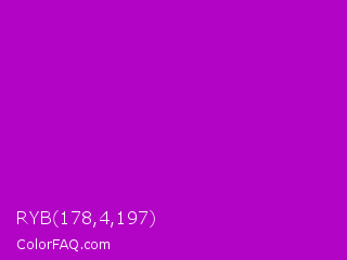 RYB 178,4,197 Color is a normal magenta color and the nearest color is Heliotrope Magenta #aa00bb. Hex code #b204c5 and RGB value is rgb(178,4,197). In RGB color space, this color is composed of 70% red, 2% green, 77% blue, In CMYK color space, this color is composed of 10% cyan, 98% magenta, 0% yellow , 23% black , In HSL color space, this color has a hue angle of 294° , 96% saturation and 39% lightness.