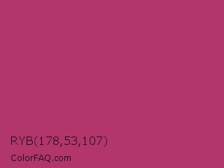 RYB 178,53,107 Color is a normal rose color and the nearest color is Hibiscus #b6316c. Hex code #b2356b and RGB value is rgb(178,53,107). In RGB color space, this color is composed of 70% red, 21% green, 42% blue, In CMYK color space, this color is composed of 0% cyan, 70% magenta, 40% yellow , 30% black , In HSL color space, this color has a hue angle of 334° , 54% saturation and 45% lightness.