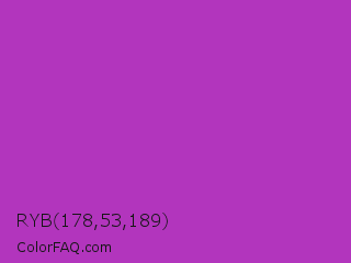 RYB 178,53,189 Color is a normal magenta color and the nearest color is Byzantine #bd33a4. Hex code #b235bd and RGB value is rgb(178,53,189). In RGB color space, this color is composed of 70% red, 21% green, 74% blue, In CMYK color space, this color is composed of 6% cyan, 72% magenta, 0% yellow , 26% black , In HSL color space, this color has a hue angle of 295° , 56% saturation and 47% lightness.
