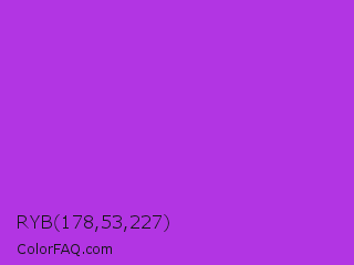 RYB 178,53,227 Color is a normal purple color and the nearest color is Veronica #a020f0. Hex code #b235e3 and RGB value is rgb(178,53,227). In RGB color space, this color is composed of 70% red, 21% green, 89% blue, In CMYK color space, this color is composed of 22% cyan, 77% magenta, 0% yellow , 11% black , In HSL color space, this color has a hue angle of 283° , 76% saturation and 55% lightness.