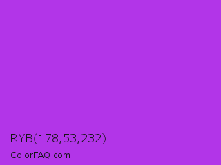 RYB 178,53,232 Color is a normal purple color and the nearest color is Veronica #a020f0. Hex code #b235e8 and RGB value is rgb(178,53,232). In RGB color space, this color is composed of 70% red, 21% green, 91% blue, In CMYK color space, this color is composed of 23% cyan, 77% magenta, 0% yellow , 9% black , In HSL color space, this color has a hue angle of 282° , 80% saturation and 56% lightness.