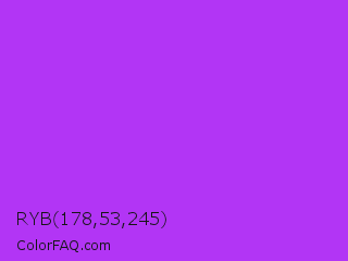 RYB 178,53,245 Color is a normal purple color and the nearest color is Veronica #a020f0. Hex code #b235f5 and RGB value is rgb(178,53,245). In RGB color space, this color is composed of 70% red, 21% green, 96% blue, In CMYK color space, this color is composed of 27% cyan, 78% magenta, 0% yellow , 4% black , In HSL color space, this color has a hue angle of 279° , 91% saturation and 58% lightness.