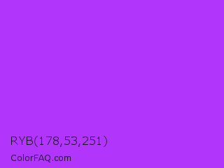 RYB 178,53,251 Color is a normal purple color and the nearest color is Veronica #a020f0. Hex code #b235fb and RGB value is rgb(178,53,251). In RGB color space, this color is composed of 70% red, 21% green, 98% blue, In CMYK color space, this color is composed of 29% cyan, 79% magenta, 0% yellow , 2% black , In HSL color space, this color has a hue angle of 278° , 96% saturation and 60% lightness.
