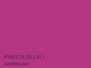 RYB 179,53,131 Color is a normal magenta color and the nearest color is Fandango #b53389. Hex code #b33583 and RGB value is rgb(179,53,131). In RGB color space, this color is composed of 70% red, 21% green, 51% blue, In CMYK color space, this color is composed of 0% cyan, 70% magenta, 27% yellow , 30% black , In HSL color space, this color has a hue angle of 323° , 54% saturation and 45% lightness.