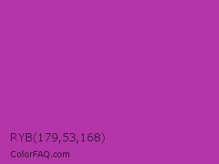 RYB 179,53,168 Color is a normal magenta color and the nearest color is Byzantine #bd33a4. Hex code #b335a8 and RGB value is rgb(179,53,168). In RGB color space, this color is composed of 70% red, 21% green, 66% blue, In CMYK color space, this color is composed of 0% cyan, 70% magenta, 6% yellow , 30% black , In HSL color space, this color has a hue angle of 305° , 54% saturation and 45% lightness.