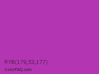 RYB 179,53,177 Color is a normal magenta color and the nearest color is Byzantine #bd33a4. Hex code #b335b1 and RGB value is rgb(179,53,177). In RGB color space, this color is composed of 70% red, 21% green, 69% blue, In CMYK color space, this color is composed of 0% cyan, 70% magenta, 1% yellow , 30% black , In HSL color space, this color has a hue angle of 301° , 54% saturation and 45% lightness.