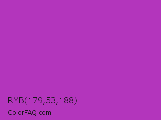 RYB 179,53,188 Color is a normal magenta color and the nearest color is Byzantine #bd33a4. Hex code #b335bc and RGB value is rgb(179,53,188). In RGB color space, this color is composed of 70% red, 21% green, 74% blue, In CMYK color space, this color is composed of 5% cyan, 72% magenta, 0% yellow , 26% black , In HSL color space, this color has a hue angle of 296° , 56% saturation and 47% lightness.
