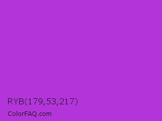 RYB 179,53,217 Color is a normal purple color and the nearest color is Steel Pink #cc33cc. Hex code #b335d9 and RGB value is rgb(179,53,217). In RGB color space, this color is composed of 70% red, 21% green, 85% blue, In CMYK color space, this color is composed of 18% cyan, 76% magenta, 0% yellow , 15% black , In HSL color space, this color has a hue angle of 286° , 68% saturation and 53% lightness.